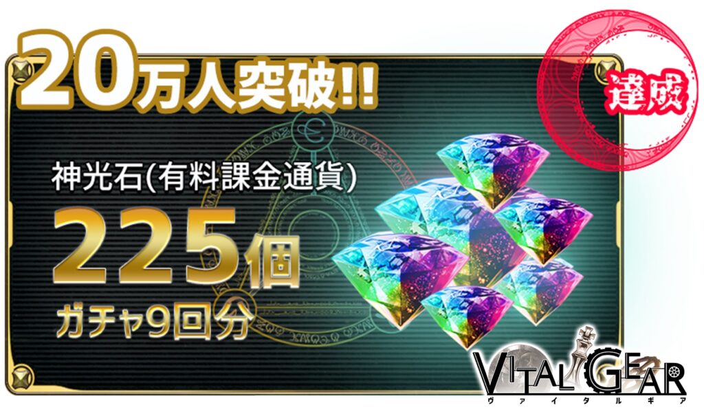 『ヴァイタルギア』では、事前登録者数に応じて特典が増える事前登録キャンペーンを開催しております。この度、事前登録者が20万人を達成いたしましたので、「神光石225個(ガチャ9回分)」を全員にプレゼントすることが確定いたしました。