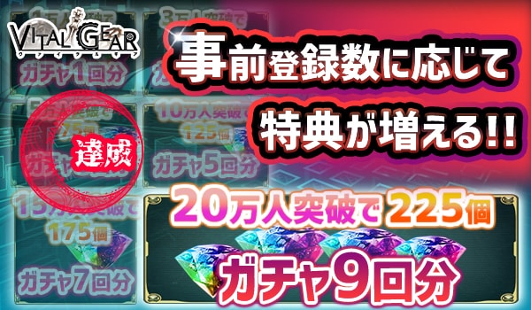 『ヴァイタルギア』では、事前登録者数に応じて特典が増える事前登録キャンペーンを開催しております。現在、「神光石175個(ガチャ7回分)」を全員にプレゼントすることが確定しております。20万人達成で「神光石225個(ガチャ9回分)」を全員にプレゼントいたします。