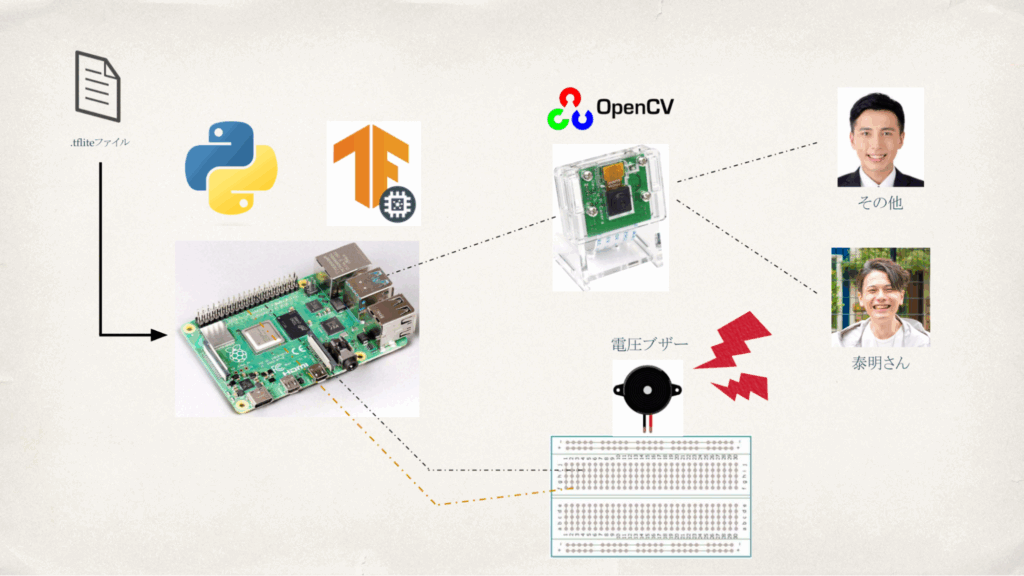 ラズベリーパイ専用のカメラから、泰明さんかどうかを判定して、泰明さんの場合はブザーがなるという顔認証アプリです。