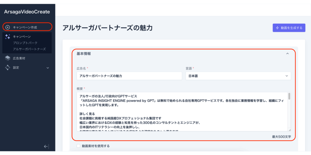 『Arsaga Video Create』にログインして「キャンペーン作成」を開始します。