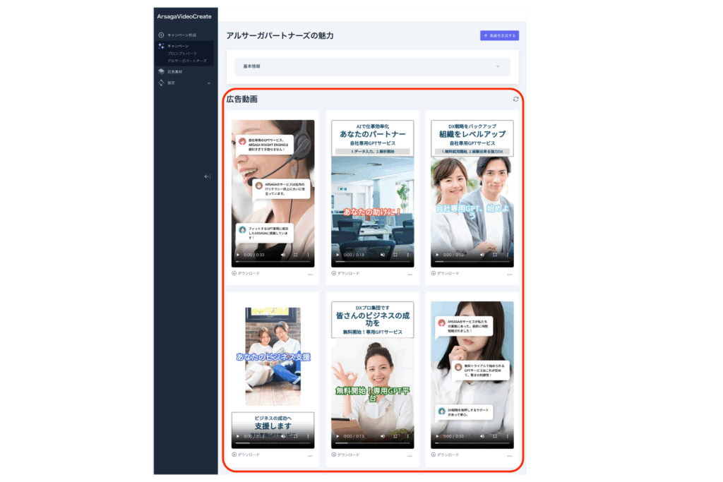 「ARSAGA VIDEO CREATE」は、生成AI技術を活用することで、専門性と適用性の高いコンテンツ制作を可能にし、最短1分で様々なビジネスニーズに適した動画コンテンツを自動生成できるサービスです。