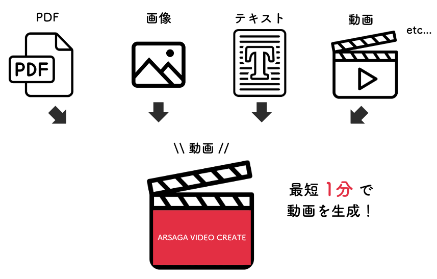 PDF、画像、テキスト、動画などの素材を、「ARSAGA VIDEO CREATE」に入れ込むことで最短1分でニーズに適した短尺動画を自動作成できます。