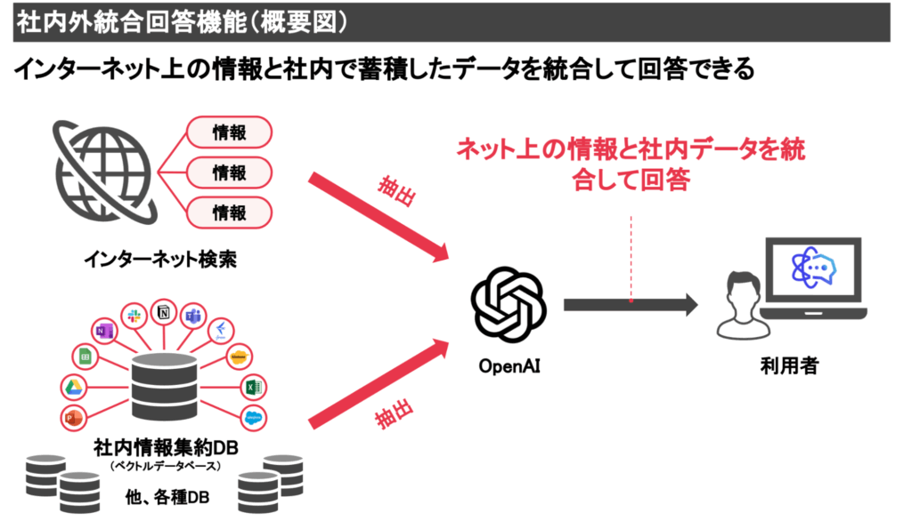 今回の新機能では、一つの質問から組織内外のデータを統合検索し、効率良く的確な回答が可能となりました。これにより、社外と社内のデータをそれぞれ検索して情報を集めるといった手間なく、GPTに一つの質問を投げかけることで、瞬時に社内外の情報を比較して分析することができます。
