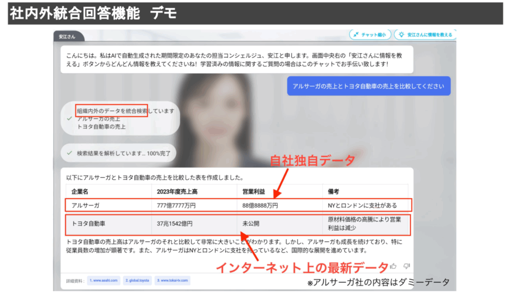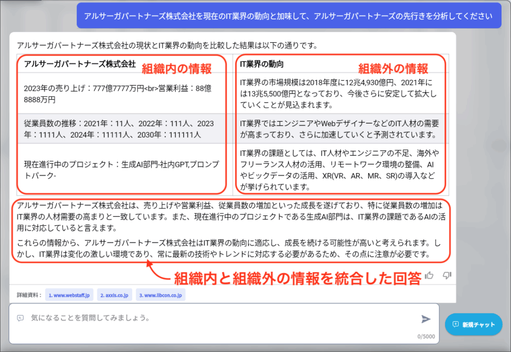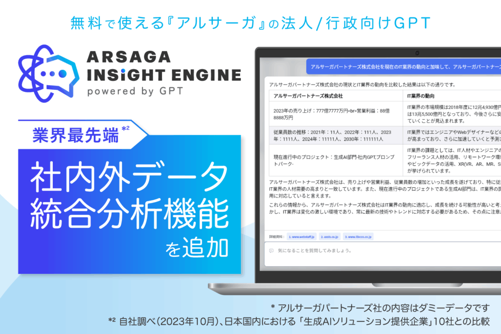 企業のDXを促進するアルサーガパートナーズ株式会社(本社:東京都渋谷区、代表取締役 /CEO・CTO:小俣泰明、以下「アルサーガパートナーズ」)は、2023年11月22日(水)より法人/行政向けGPTサービス『ARSAGA INSIGHT ENGINE powered by GPT』に企業独自の情報とインターネット上の情報を統合して回答ができる、「社内外データ統合分析機能」をリリースしたことをお知らせいたします。社内と社外のデータを同時に分析することによって、企業の戦略的な利点を最大限に活用し、効率性を向上させます。