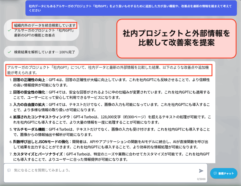例1)社内データにもあるアルサーガのプロジェクト「社内GPT」をより良いものにするために追加した方が良い機能や改善点を、最新の情報を踏まえて提案してください。