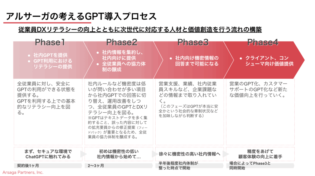 GPT導入プロセスとして、まずは全従業員に対しセキュアな環境でGPTを利用し、運用改善を繰り返すことで社内でGPTを理解し育てるフェーズが必要です。社内活用を通じて、従業員のDXリテラシーの向上とともに、将来的には収集した情報を活用し、社内情報だけでなくクライアントやコンシューマにも展開することが容易になります。