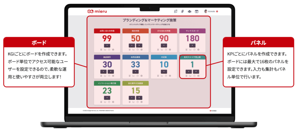 KPIのパネルでは、カウント数だけでなく数値とテキストの入力も可能です。進捗はリアルタイムで更新されます。