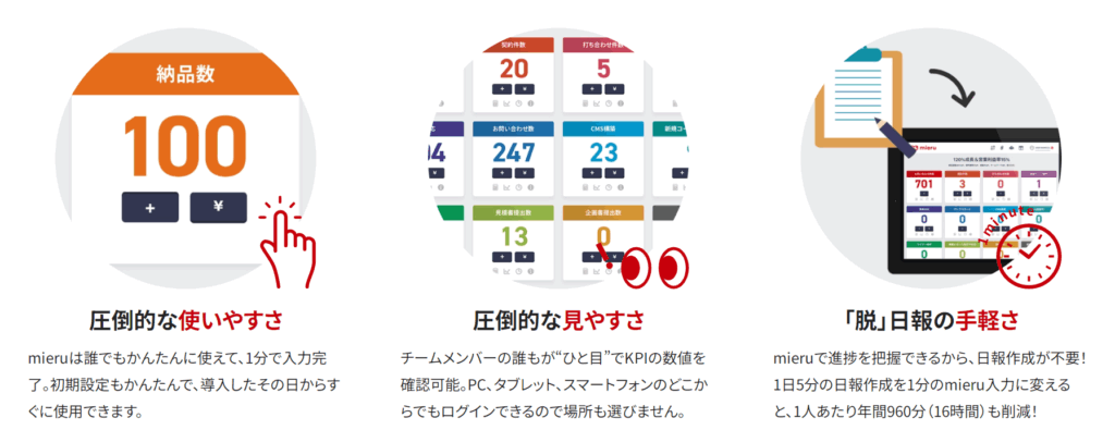 mieruは誰でもかんたんに使えて、1分でデータ入力完了。初期設定もかんたんで、導入したその日からすぐに使用できます。