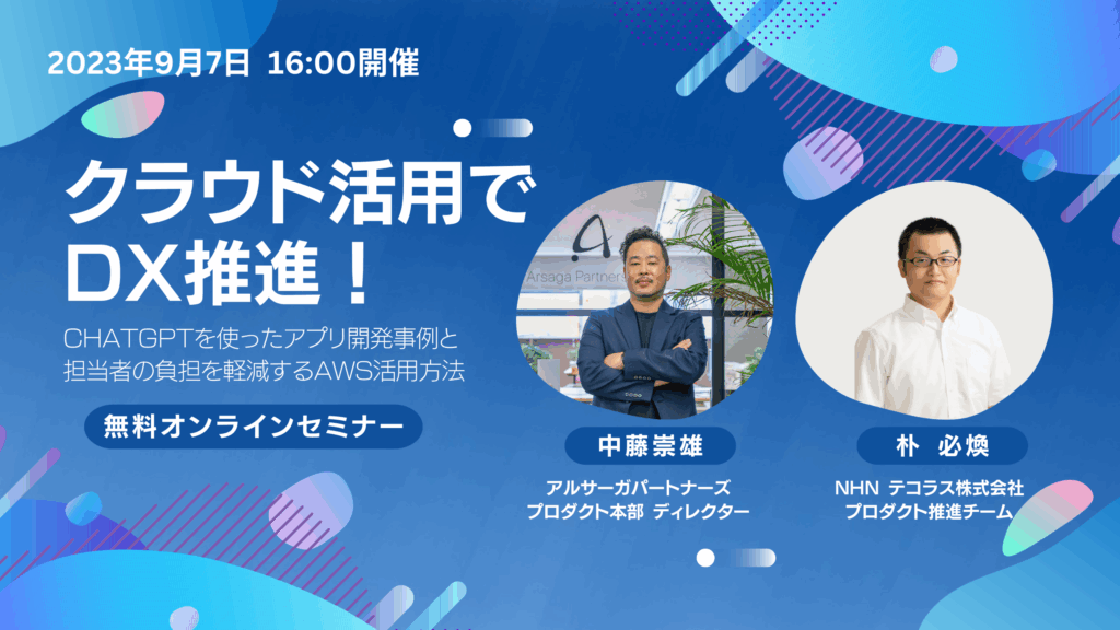 企業のDXを促進するアルサーガパートナーズ株式会社(本社:東京都渋谷区、代表取締役 /CEO・CTO:小俣泰明、以下「アルサーガパートナーズ」)は、2023年9月7日(木)にNHN テコラス株式会社主催「クラウド活用でDX推進!ChatGPTを使ったアプリ開発事例と担当者の負担を軽減するAWS活用方法」のオンラインセミナーに、アルサーガパートナーズプロダクト本部ディレクターの中藤崇雄が登壇することをお知らせします。
