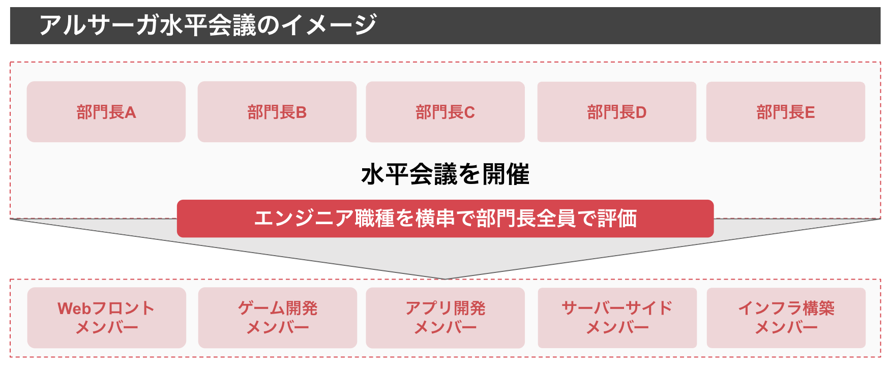 人事評価制度における水平的評価は、一般的に組織内で被評価者と同等の階層の者が被評価者を評価することで、評価者と被評価者の組織内での階層が同等であることが前提となりますが、この度アルサーガパートナーズで導入したのは、エンジニア部門の評価を行う際に、エンジニアの職種を横串で部門長同士が評価を共有することにより、忖度評価などを牽制するといったもので、この評価制度を含む取り組みを「アルサーガ水平会議」と呼び導入いたしました。