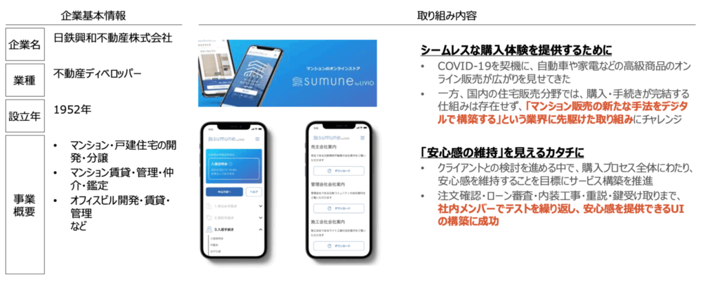 sumune for LIVIOは、ネットで自動車が購入できる世の中で、マンションも購入できる時代を目指す、カスタマーの購買行動のオンラインシフトにチャレンジした日鉄興和不動産様とのDX事例です。物件情報の閲覧・検討に加え、マンションの購入にあたり必要な申し込み手続きや住宅ローン手続き、契約手続きを、ワンストップかつシームレスに提供できる仕組みを実現いたしました。