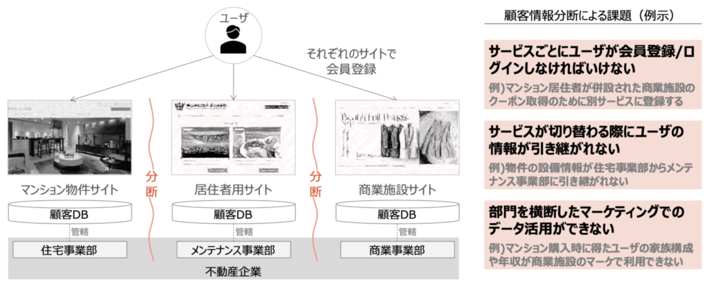 国内不動産業界におけるDX課題の具体例の一つとして、サービスの管轄部門が縦割りになっていることが挙げられます。これにより、同一の顧客を部門横断で捉えることができず、ユーザーのシームレスな体験の妨げになっているだけでなく、企業にとっても顧客情報を最大限活用できない状態を生み出しています。