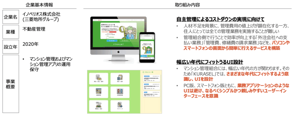 築30年を超えるマンションにおいて問題となっている、エレベーターや立体駐車場などの設備老朽化に伴う莫大な修繕費を賄うことを目的として、マンション管理業務の改革を目指したイノベリオス様との事例です。