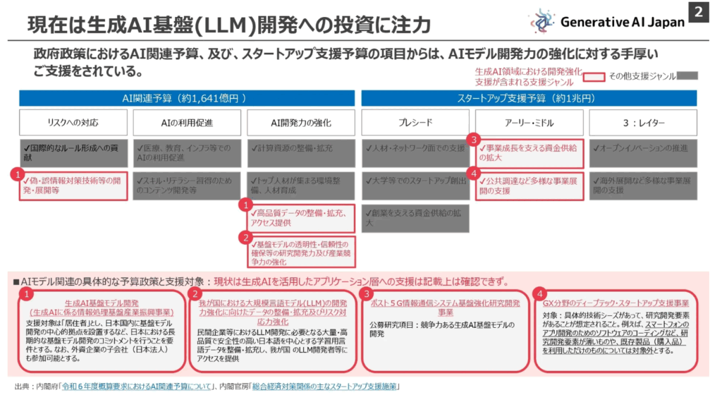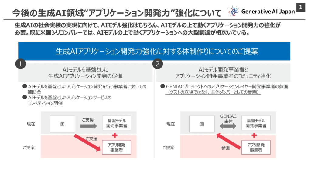 日本におけるAI関連予算や支援項目の現状を背景に、今後の生成AIアプリケーション開発力強化に対する体制づくりについて提案を取りまとめたものです。当日はアルサーガパートナーズ代表の小俣を含め、GenAIから3名とELYZAの代表が登壇し、意見交換の場では活発に意見が交わされました。今回の意見交換を生かし、今後の議論を深めてまいります。