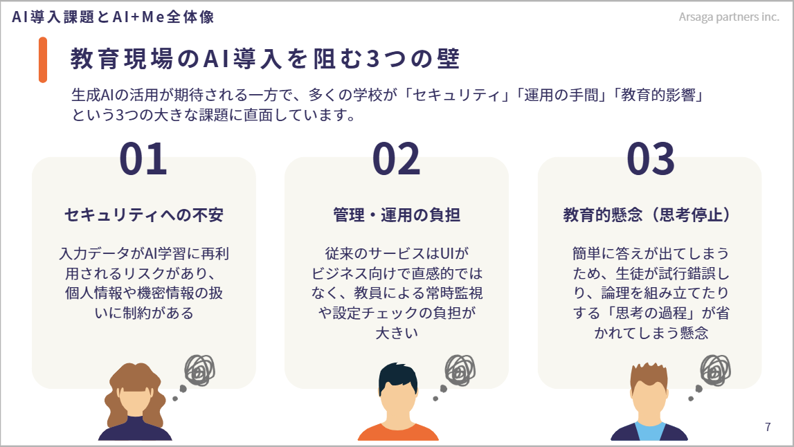 本資料では、教育現場でよく挙がるご意見をもとに、生成AI導入における複数の課題を提示。汎用的な生成AIでは障壁となる課題についても、AI+Meだからこそ実現できる解決策を分かりやすく解説しています。