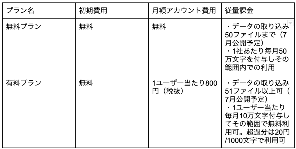 無料プランでは取り込みができるデータ量や回答文字数に上限があります。1ユーザーあたりの単価で契約する有料プランにおいては、データ量に上限はありませんが、回答文字数の上限を超えた場合に従量課金で料金が発生します。