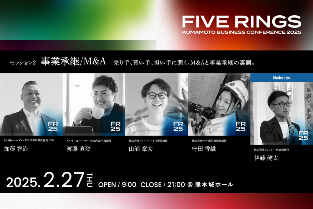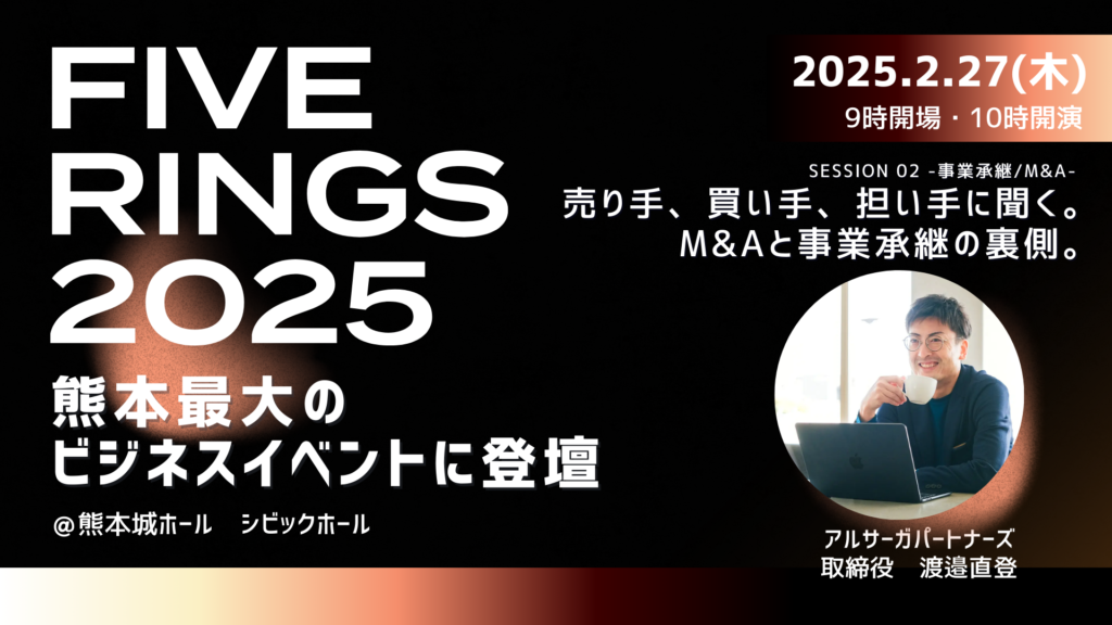 本イベントは熊本県、熊本市、FIVE RINGS実行委員会(エルボーズ、サイバーレコード、肥後銀行、熊本銀行、熊本日日新聞)の共催により、熊本城ホールの2階・3階を使用して開催。50名以上の経営者や自治体関係者が登壇し、ビジネスピッチ、トークセッション、企業・行政出展ブースなどが展開されます。渡邉はトークセッション「Session 02 -事業承継/M&A-」に登壇し、売り手・買い手・担い手の視点からM&Aと事業承継のリアルな裏側を語ります。