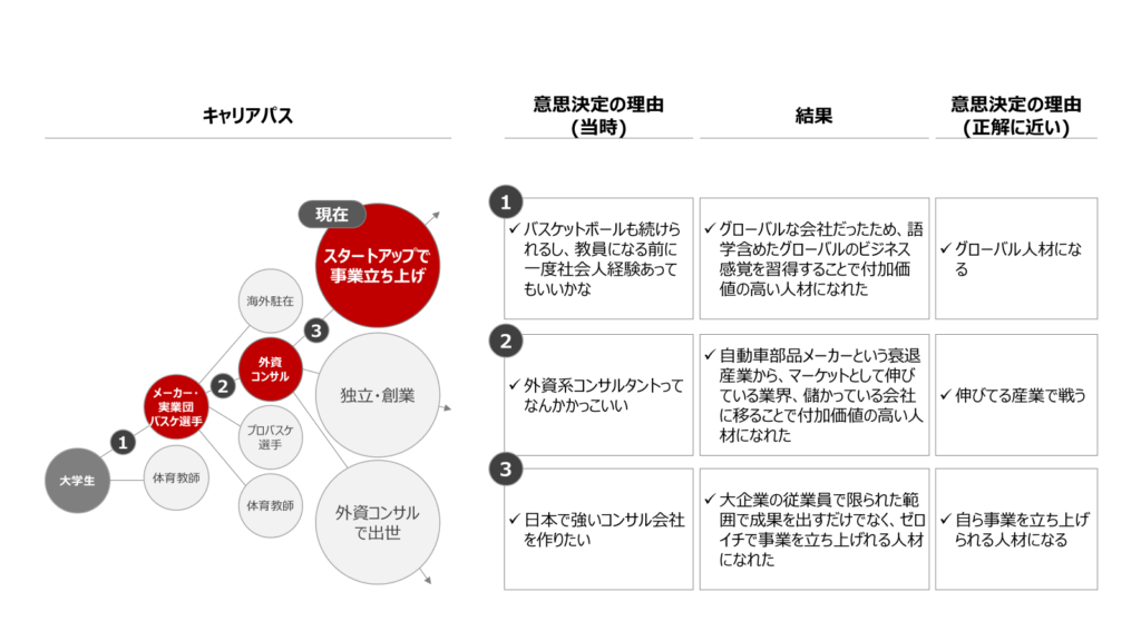 結果的にファーストキャリアで「グローバル人材」となり、二度目の意思決定によって「成長産業のなかで付加価値の高い人材」となり、現職では「事業を立ち上げてスケールする力」を得ましたが、どこかで誤った判断をしていたら、今のような優位なキャリアにならなかった可能性があります。皆さんには都度正しい意思決定をして、優位なキャリアをつくってもらいたいです。