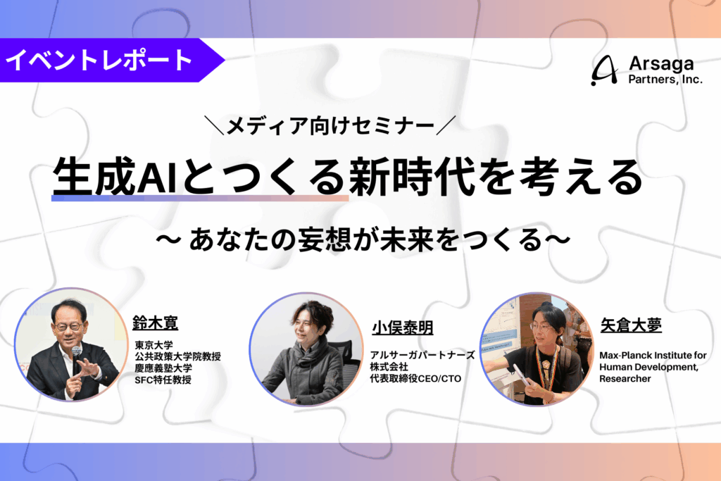 企業のDXを促進するアルサーガパートナーズ株式会社(本社:東京都渋谷区、代表取締役社長 CEO/CTO:小俣泰明、以下「アルサーガパートナーズ」)は、2024年6月20日(木)に本社オフィスにて、メディア向けセミナー「生成AIとつくる新時代を考える」を開催しました。東京大学 公共政策大学院 教授 兼 慶應義塾大学大学院 政策メディア研究科 教授の鈴木寛教授と、ドイツ・マックスプランク人間開発研究所 研究員の矢倉大夢氏をお招きし、弊社代表の小俣とそれぞれの観点から生成AIの現状と未来を語りました。