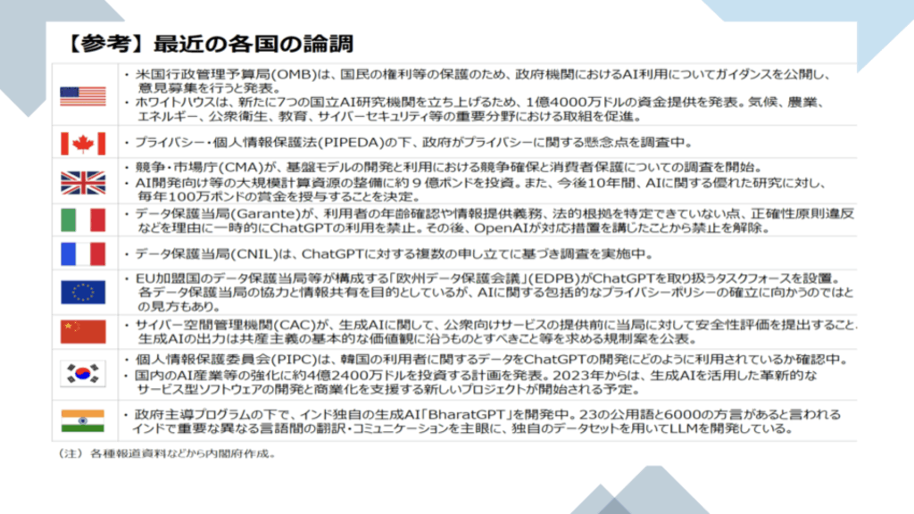 デジタル庁では、生成AIの進歩や普及を踏まえた対応に重点を置いた政策を進めており、各国のレギュレーションは大きく異なっています。例えば、ヨーロッパではかなり慎重な姿勢を見せており、特にフランスではChatGPTの利用が禁止されています。一方、アメリカでは1億4000万ドルを投じて、気候や農業などの分野でAIの活用を進めているなど、生成AIに対する向き合い方に違いが出始めています。