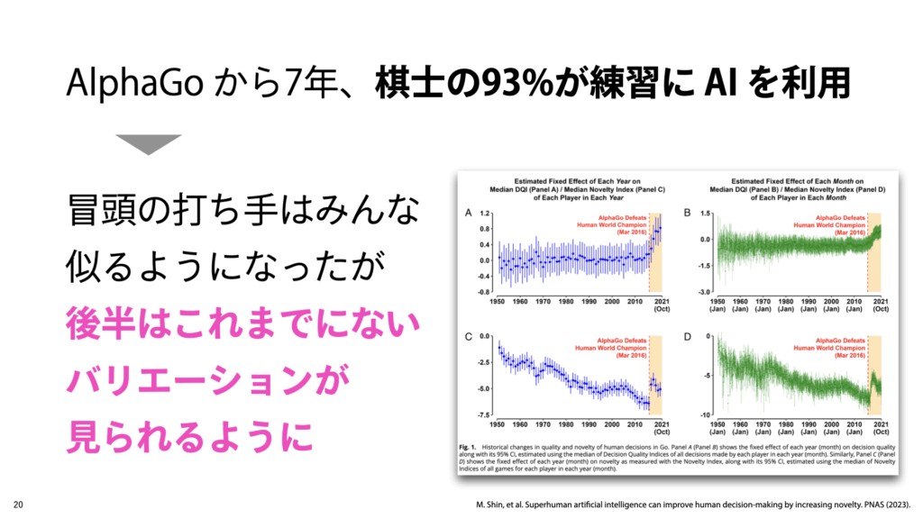 実際に囲碁の世界では、同様の現象がすでに起きています。2016年に囲碁AI「AlphaGo」が世界王者を破り話題となった際には、AIが棋界だけでなく世界をも滅ぼすのではないかとまで言われました。しかし今、棋界では面白いことが起こっています。