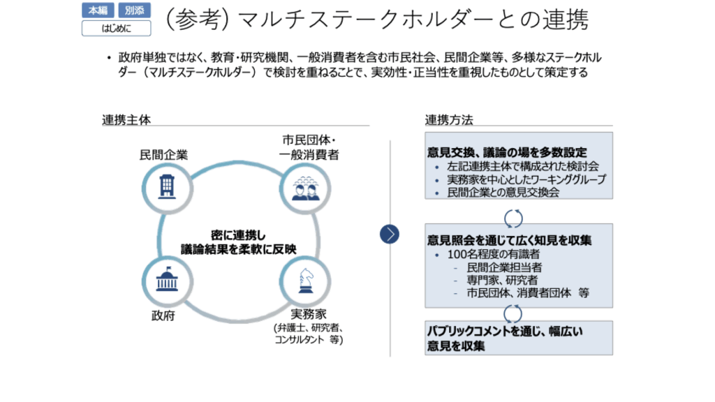 これまでは、官僚が考えた政策が上意下達で一方的に伝えられる形でした。しかし、これからは政府だけでなく、民間企業、市民団体、一般消費者、実務家を含む100名ほどが常に連携し意見交換を行い、パブリックコメントを取り入れながら議論し、その結果を柔軟に反映しながらガバナンスが形成されていくことになります。