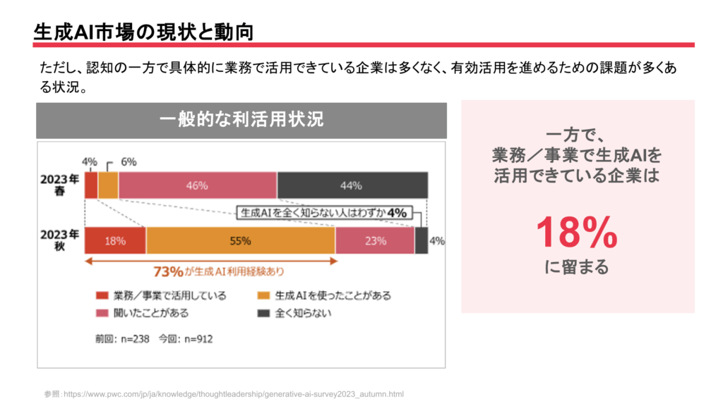 国内の企業における生成AIの導入状況は、今後1年以内に本格的な導入を検討している企業が58%に達しており、生成AIへの関心が高まっていることが伺えます。一般的な利活用状況は、2023年現在では87%と非常に高い一方で、実際に業務や事業で生成AIを活用できている企業は18%にとどまっています。
