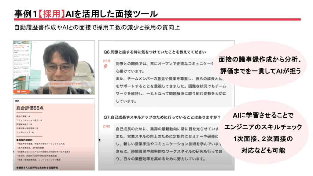 たとえば、アルサーガパートナーズの開発事例として、採用業務に生成AIを活用した面接ツールがあります。このツールでは、生成AIと音声を使って面接を行い、会話データの結果から総合評価を行います。AIが様々な情報から客観的に適正を判断をするので、書類選考で落ちてしまう人の中にも可能性ある人材を見つけ出すことができます。