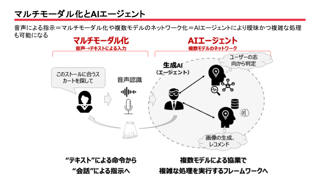 さらに、テキストだけでなく音声や表情などの指示をマルチモーダル化することにより、生成AIは曖昧かつ複雑な処理も可能になります。このマルチモーダル化したアプリケーションは、あらゆる業種・業界で活用ができます。