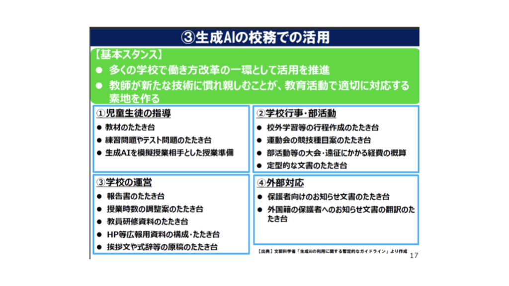 鈴木寛教授の専門の教育分野において、生成AIガイドラインが文部科学省によって発表されました。すでに情報モラル教育や英会話などでの活用が進んでいます。特に重要なのは、校務情報を生成AIを使ってどのように効率化していくのかという点です。生成AIは教員の働き方改革にプラスの影響を与えてくれています。今年は生成AIの校務での活用は大いに進歩すると考えられます。