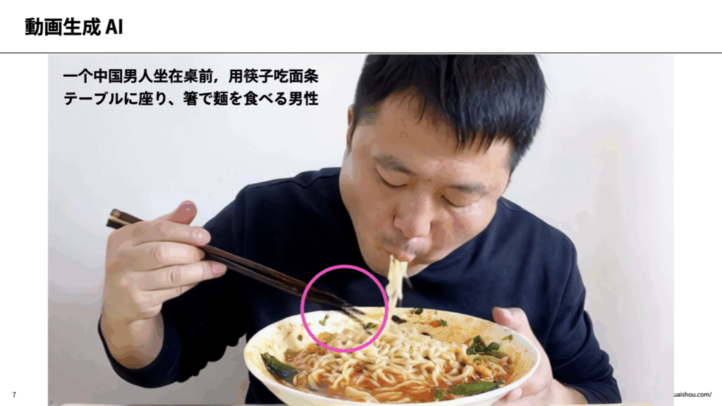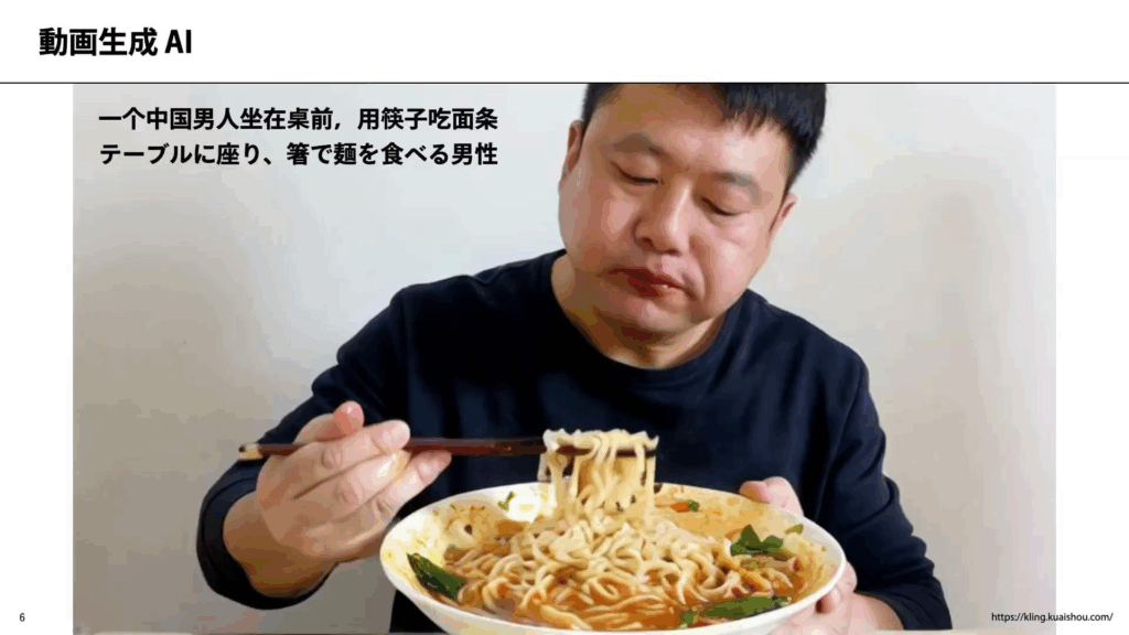 ・動画生成AI:例えば、「テーブルに座って箸で麺を食べる中国人男性の動画をつくってください」と指示を与えると、どこかのスタジオで撮影したかのような動画が作成できる。