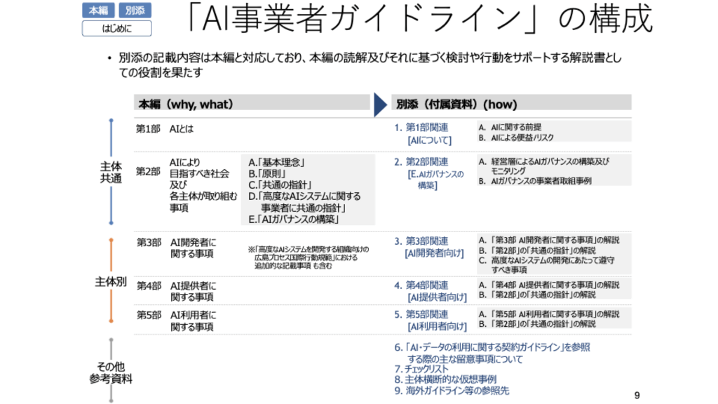 日本でもこれまで生成AIに対するレギュレーションは複雑でしたが、2024年4月に総務省と経済産業省が協力しAI事業者ガイドラインを策定しました。AIの進歩の速度に対して法律で対応するのは難しいため、日本ではガイドライン方式が採用されました。この方式により、技術革新や世の中の状況に応じて、柔軟に対応していくことが可能となります。