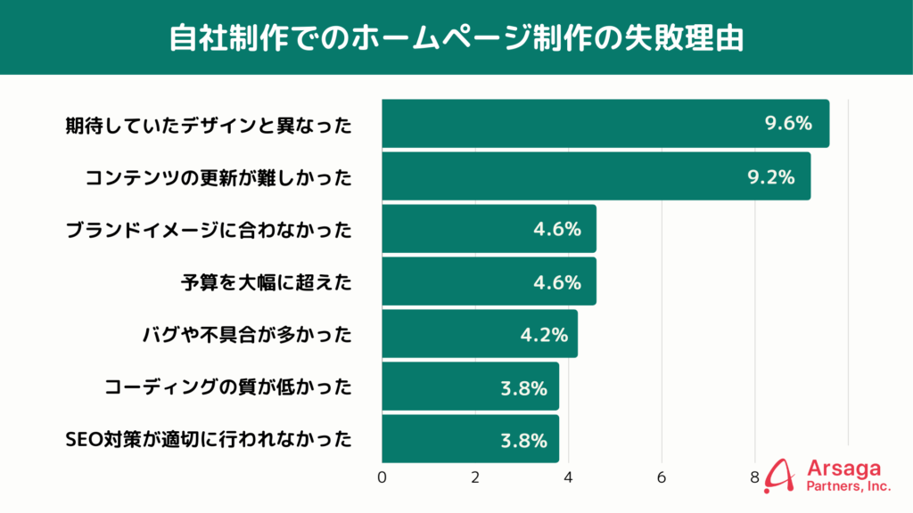 自社制作ホームページでの失敗理由は「デザイン品質不足」や「コンテンツ更新の難しさ」など