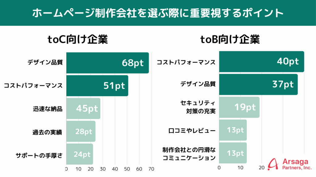 ・ホームページ制作会社選定でtoC向け企業は「デザイン品質」、toB向け企業は「コスパ」を重視
