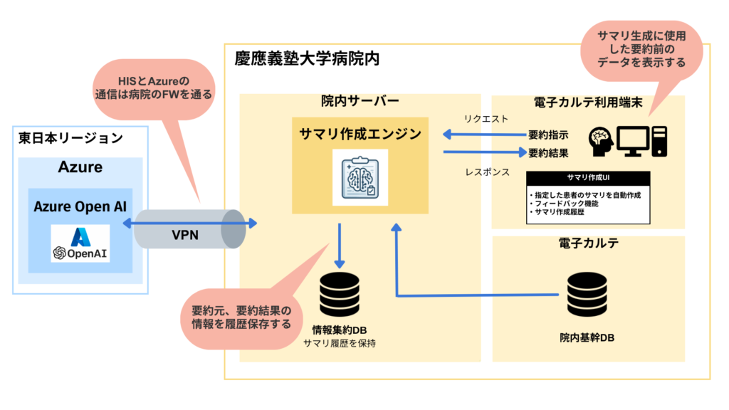 また、電子カルテには膨大な入院履歴が記録されており、これをすべて確認しながら必要な情報を抽出・要約するプロセスが医療従事者にとって大きな課題となっていました。一から文書を作成するより、基盤となる内容を自動生成する仕組みがあれば、作業の効率化が大いに期待されます。しかし、膨大な個人情報を取り扱う医療現場では、厳格な管理や生成AIのハルシネーション(AIの誤認)への対策も不可欠です。