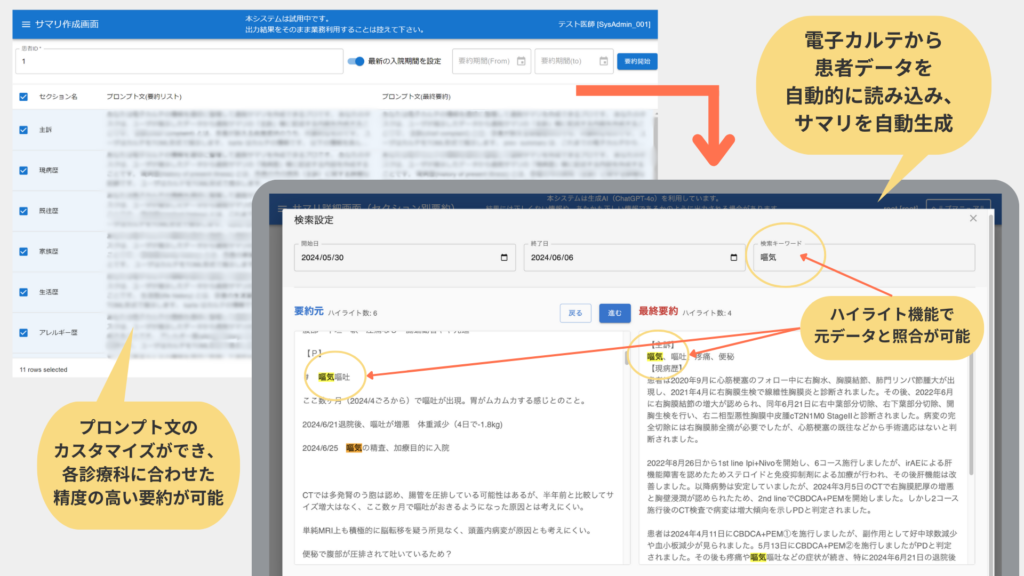 ハルシネーションを防ぐためのキーワードハイライト機能を追加しました。ハイライトされたキーワードを元データと照合することで不正確な情報を早期に発見でき、正確性が向上します。この機能により、医療現場でのAI利用をより安全かつ実務的なものにします。