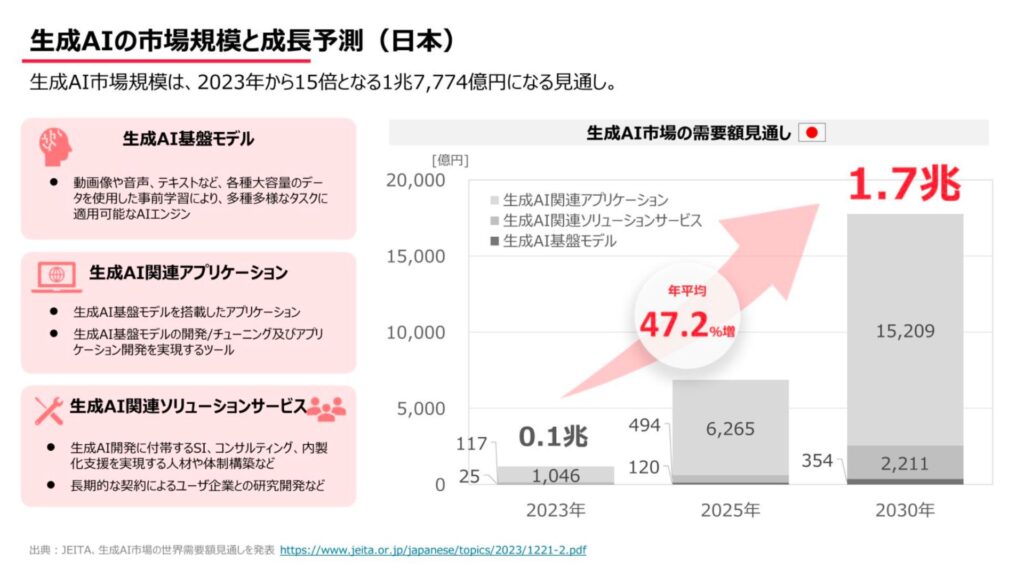 2030年までに生成AI市場は1.7兆円に達するとの予測があり、生成AIを活用した営業の効率化に大きな期待が寄せられています。