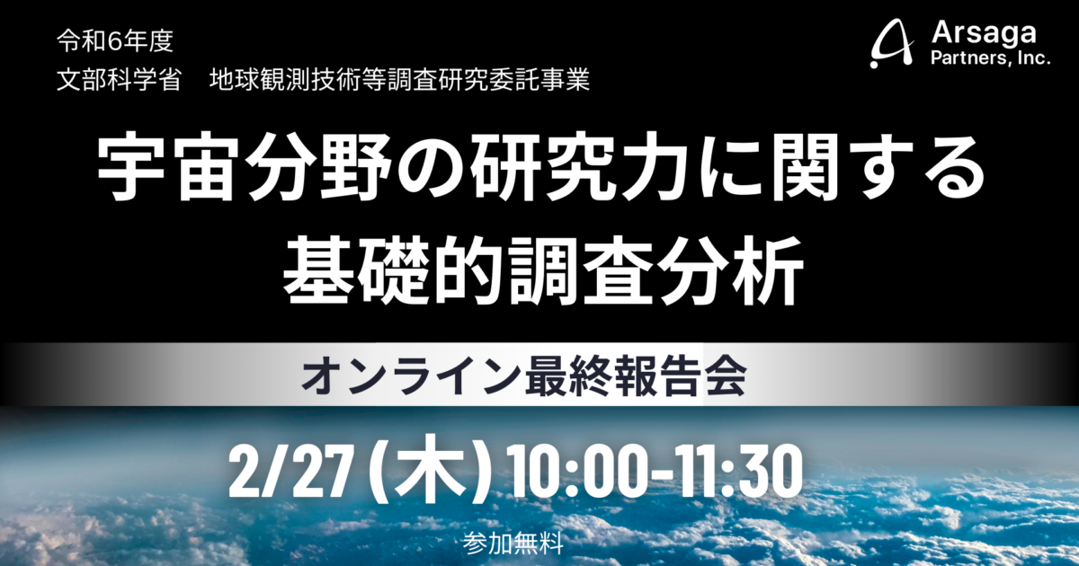 アルサーガパートナーズは、文部科学省【宇宙分野の研究力に関する基礎的調査分析】の最終報告会をオンラインで開催。受託事業の調査結果と、宇宙分野のDXに関する知見を報告します。