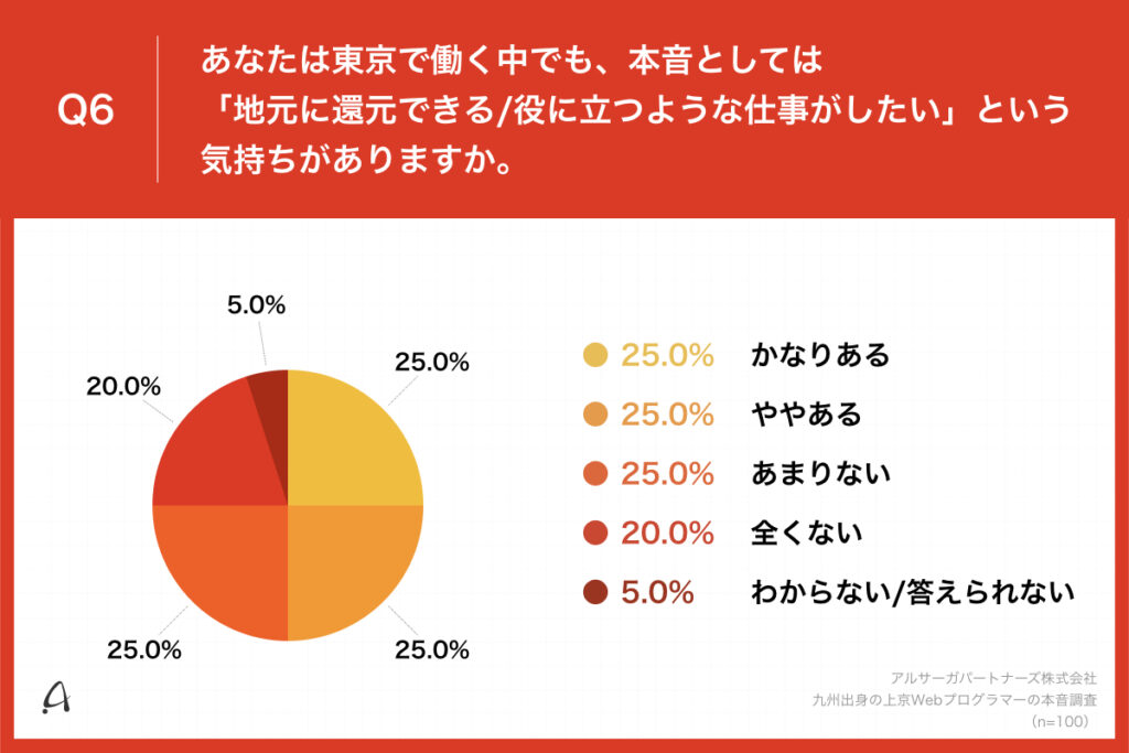 「Q6.あなたは東京で働く中でも、本音としては「地元に還元できる/役に立つような仕事がしたい」という気持ちがありますか。」(n=100)と質問したところ、「かなりある」が25.0%、「ややある」が25.0%という回答となりました。