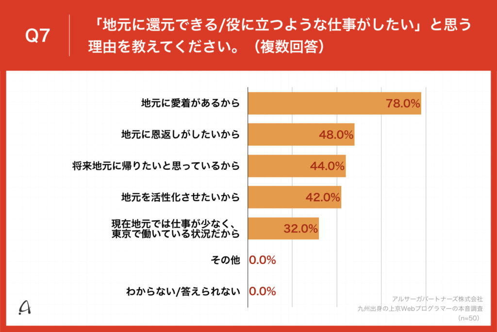 Q6で「かなりある」「ややある」と回答した方に、「Q7.「地元に還元できる/役に立つような仕事がしたい」と思う理由を教えてください。(複数回答)」(n=50)と質問したところ、「地元に愛着があるから」が78.0%、「地元に恩返しがしたいから」が48.0%、「将来地元に帰りたいと思っているから」が44.0%という回答となりました。