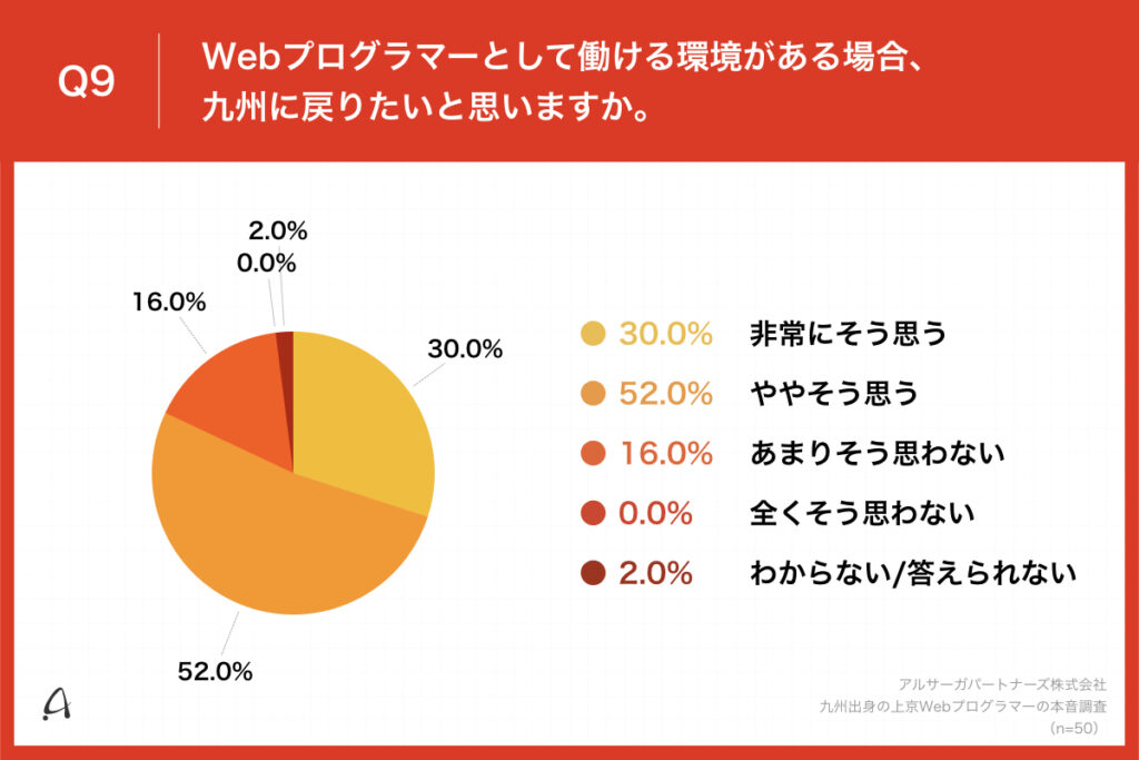 Q6で「かなりある」「ややある」と回答した方に、「Q9.Webプログラマーとして働ける環境がある場合、九州に戻りたいと思いますか。」(n=50)と質問したところ、「非常にそう思う」が30.0%、「ややそう思う」が52.0%という回答となりました。