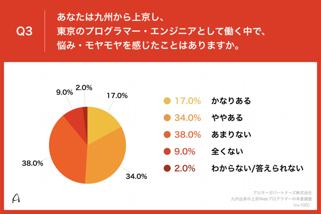「Q3.あなたは九州から上京し、東京のプログラマー・エンジニアとして働く中で、悩み・モヤモヤを感じたことはありますか。」(n=100)と質問したところ、「かなりある」が17.0%、「ややある」が34.0%という回答となりました。
