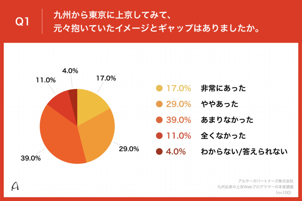 「Q1.九州から東京に上京してみて、元々抱いていたイメージとギャップはありましたか。」(n=100)と質問したところ、「非常にあった」が17.0%、「ややあった」が29.0%という回答となりました。