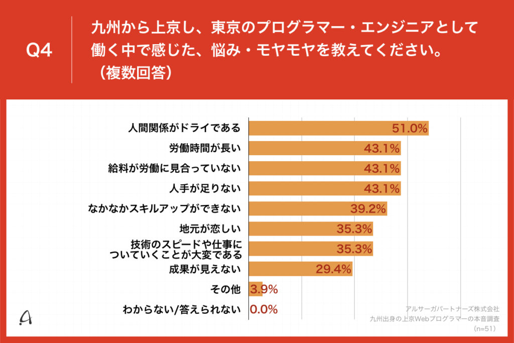 企業のDXを促進するアルサーガパートナーズ株式会社(本社:東京都渋谷区、代表取締役:小俣泰明)は、2023年1月27日(金)〜2月9日(木)に、東京で働いている九州出身のWebプログラマー・エンジニア100名を対象に、九州出身の上京Webプログラマーの本音調査を実施いたしました。