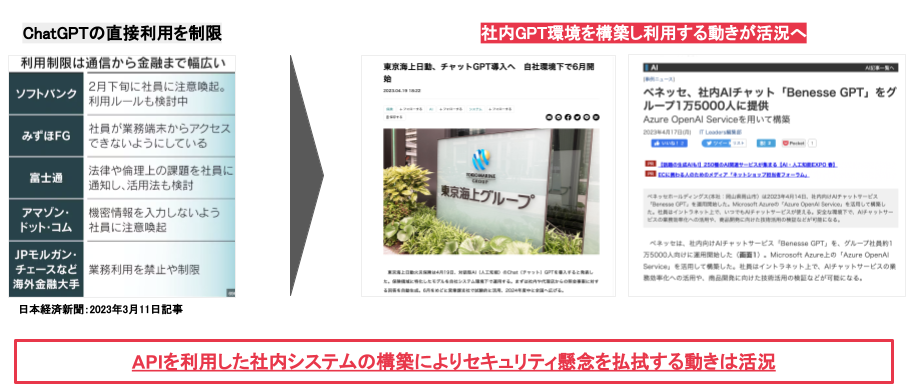 アルサーガパートナーズが行ったChatGPTに関する経営者の意識調査によると、ChatGPTの利用を制限している企業の主な理由は「情報漏洩や著作権侵害などのリスクへの懸念」であることが明らかになりました。セキュリティ上の懸念を解消するため、多くの企業が直接的なChatGPTの利用を制限し、社内でGPT環境を構築して活用する動きが広がっています。