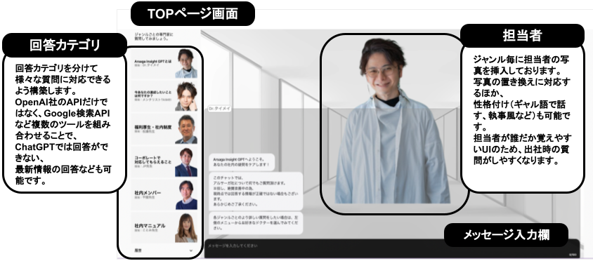 アルサーガパートナーズのGPTソリューションはシステムのみならず、視覚効果による認知の向上を重視し、UX/UIの工夫による回答認知向上を想定したデザインを行っています。