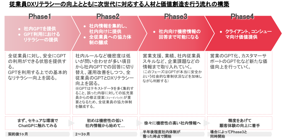 フェーズ1のように社内でGPTを導入する企業は増加傾向にありますが、導入後、社内での浸透が進まないといったご相談をいただくことも少なくありません。しかし、最終的にクライアント向けのGPTサービスを提供するためには、社内でGPTを活用し安全性や品質の高さを理解するフェーズが必要です。そのため、フェーズ2やフェーズ3のように社内情報を集約した社内向けのGPTを提供することで、全従業員の協力体制の醸成をしつつGPTとDXリテラシーを向上を図ることから始めるのが重要だと考えます。
